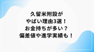 大学・高校 久留米附設がやばい理由3選!お金持ちが多い?偏差値や進学実績も! 福岡県久留米市にある久留米大学附設(くるめだいがくふせつ)高校(以下、久留米附設)は、中高一貫教育の男女共学校です。久留米附設中学からの内部進学組と、高校から入学した生徒が一緒に学ぶ併殺型の中高一貫校であり、その圧倒的な進学実績で福岡県外か... 2025.09.08 大学・高校