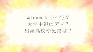 エンタメ &team k (ケイ)が大学中退はデマ?出身高校や兄弟は? 日本を中心にグローバルに活躍する人気グループ 『&team』の最年長メンバー ケイくん。モデル並みの高身長・186.5㎝のケイくんは、何を着ても似合い"リアル王子様"といわれるほどです。メインダンサー兼リードボーカルを務めるケイくんですが、... 2025.09.10 エンタメ