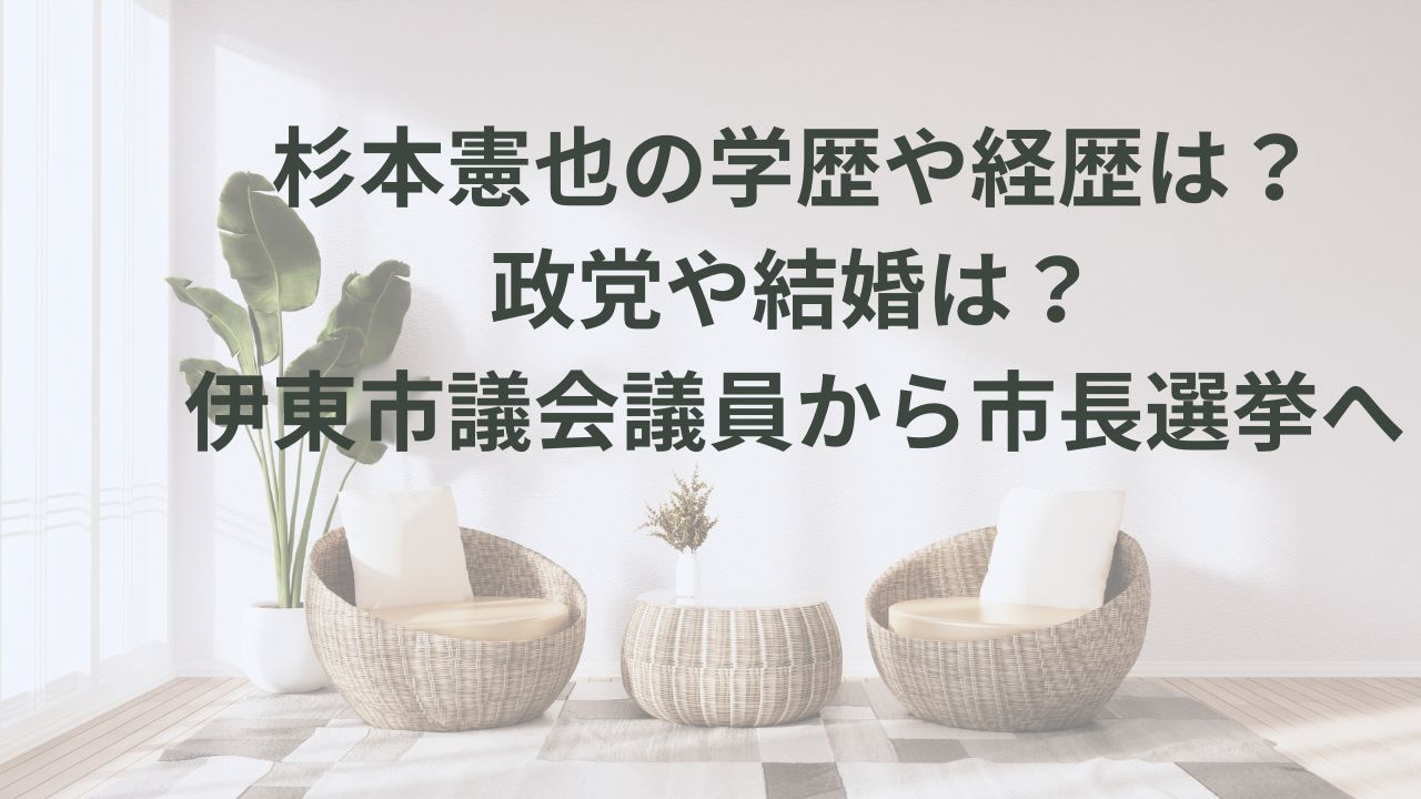 この記事では、静岡県伊東市の市長選挙に立候補を表明している杉本憲也さんの学歴や経歴、政党やご家族に関する情報を詳しくお伝えしていきます。